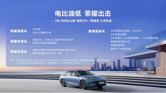伴随宋PLUS荣耀版、海豹DM-i荣耀版的上市,比亚迪还准备了多重购车礼遇,自上市之日至3月31日24:00前完成购车开票,购买宋PLUS荣耀版可享2年0息、4000元置换补贴、全系2年免费云服务和车机流量(5GB/月)等多重礼遇。
