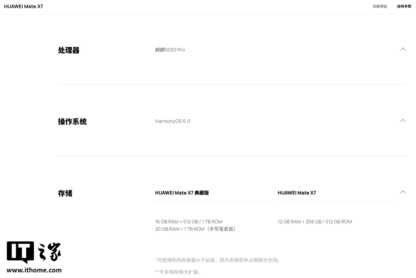 IT之家从华为官网获悉,华为 Mate X7 全系搭载麒麟 9030 Pro 处理器。另外,Mate X7 典藏版还独占 16GB 和 20GB 的运存规格版本。