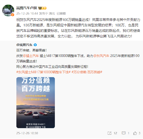12月26消息,东风汽车达成2025年度新能源100万辆销量,岚图汽车科技股份有限公司董事长、党委书记发文表示,祝贺东风汽车2025年度新能源100万辆销量达成!岚图非常荣幸参与其中并贡献力量。100万新能源,是东风顺应中国新能源汽车转型发展的结果;100万,也是民族汽车品牌崛起的重要标志。站在东风新能源百万销量达成的新起点,我们将继续坚定不移坚持高质量发展,全力以赴, 为东风新能源事业腾飞注入岚图动力!