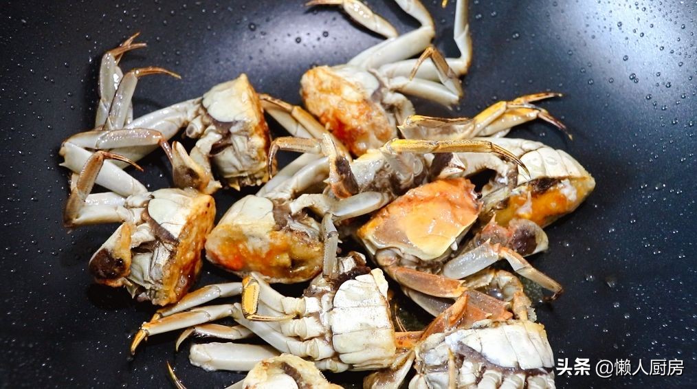 煎到切面发黄(huang),螃蟹变色,捞出螃蟹,放(fang)一边备用。