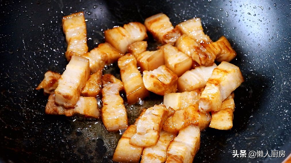 等猪(zhu)肉煎出多余的油脂,五花肉表面(mian)微微发黄,把煎好的五花肉先夹出(chu)来。