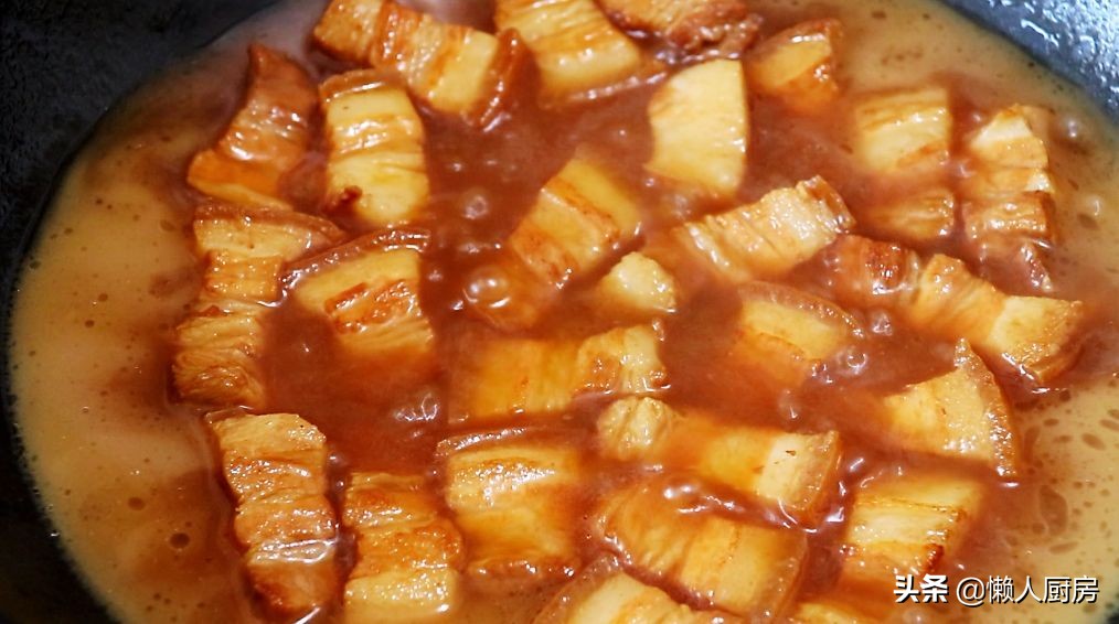 com等糖炒到深褐色、开(kai)始起泡泡的时候,倒入煎过(guo)的五花肉,翻炒均匀,使每块五(wu)花肉上都均匀的裹满糖色。