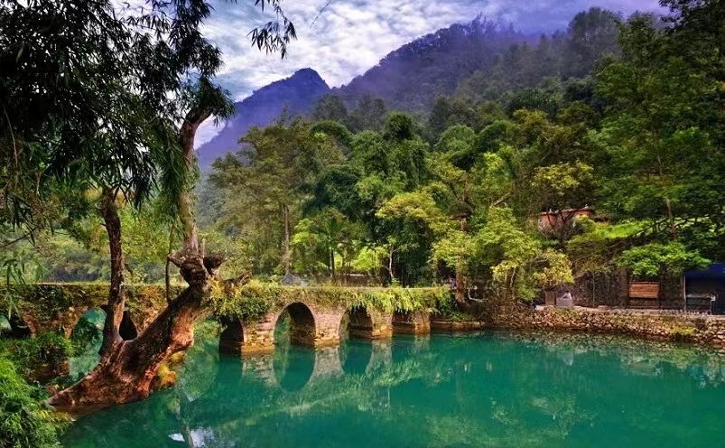 五、小七孔小七孔,位于群山之中,为一段长狭长的幽谷,集林、泉、溪、瀑、岩、湖、藤等多种自然景观为一体,精美秀丽,因一座“小七孔古桥”而得名,素有“超级盆景”的美誉。