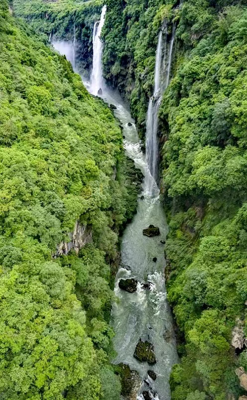然而,说到马岭河峡谷的核心,最美的地段当属天星画廊,数十条瀑布宛如千军万马,呼啸而过,宛若银河落地,堪称一绝。特别是画廊北端的万马奔腾瀑布,未见其身,先闻其名,从二百米的高处倾泻而下,在岩石上冲撞下来,水花如雾飞散,那种壮观和震撼,无以言表。