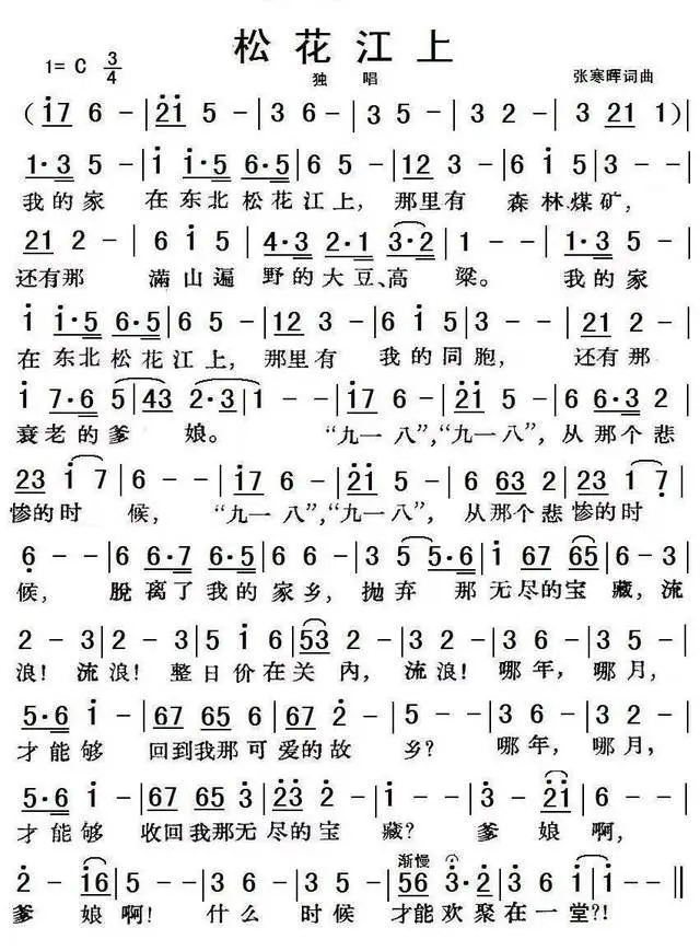 “我的(de)家在东北松花江上,那里有森林煤矿,还(hai)有那满山遍野的(de)大豆高粱。我的家在东北松花江(jiang)上,那里有我的同胞,还有(you)那衰老的爹娘。”