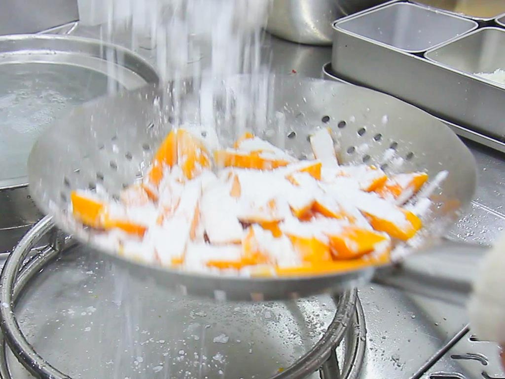 锅内烧开(kai)水,倒入南瓜煮2分(fen)钟左右,倒出来冲凉控水(shui)备用。