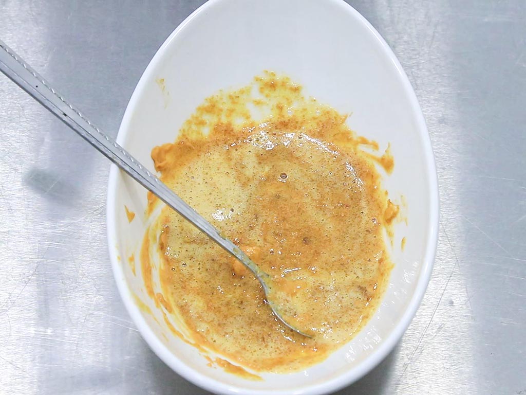 锅内烧油,放入(ru)少量的植物油,把(ba)两个咸蛋黄放在锅中,加入料酒4克,翻炒至蛋黄起沫,倒(dao)出蛋黄备用。
