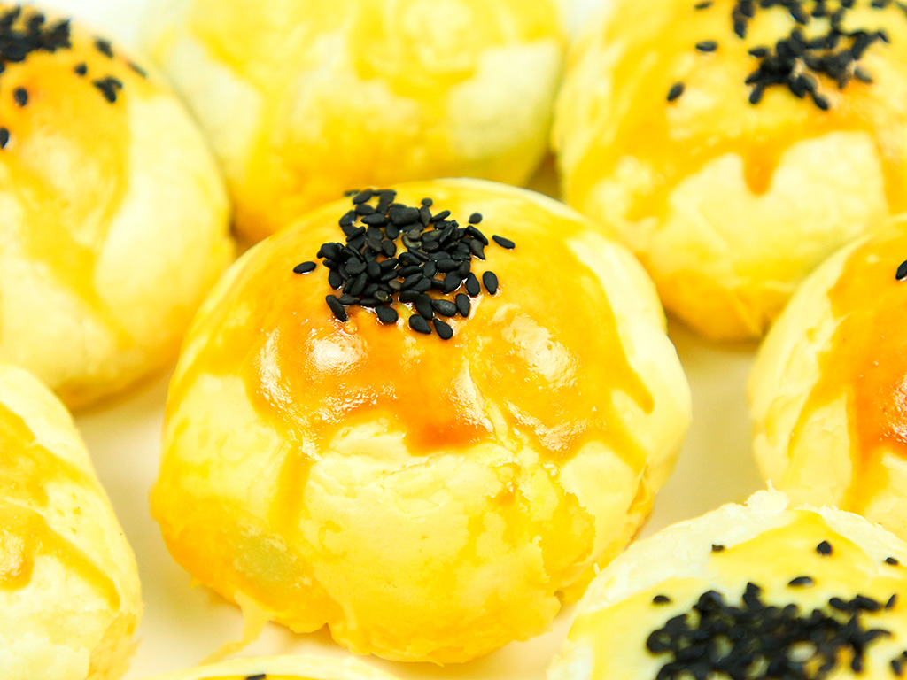 准(zhun)备一个小盆打入两个鸡蛋黄备用(yong),烤盘上铺一张吸油纸(zhi),把包好的蛋黄酥放在(zai)烤盘中,再均匀刷一层鸡蛋黄,最后(hou)撒点黑芝麻点缀一下。