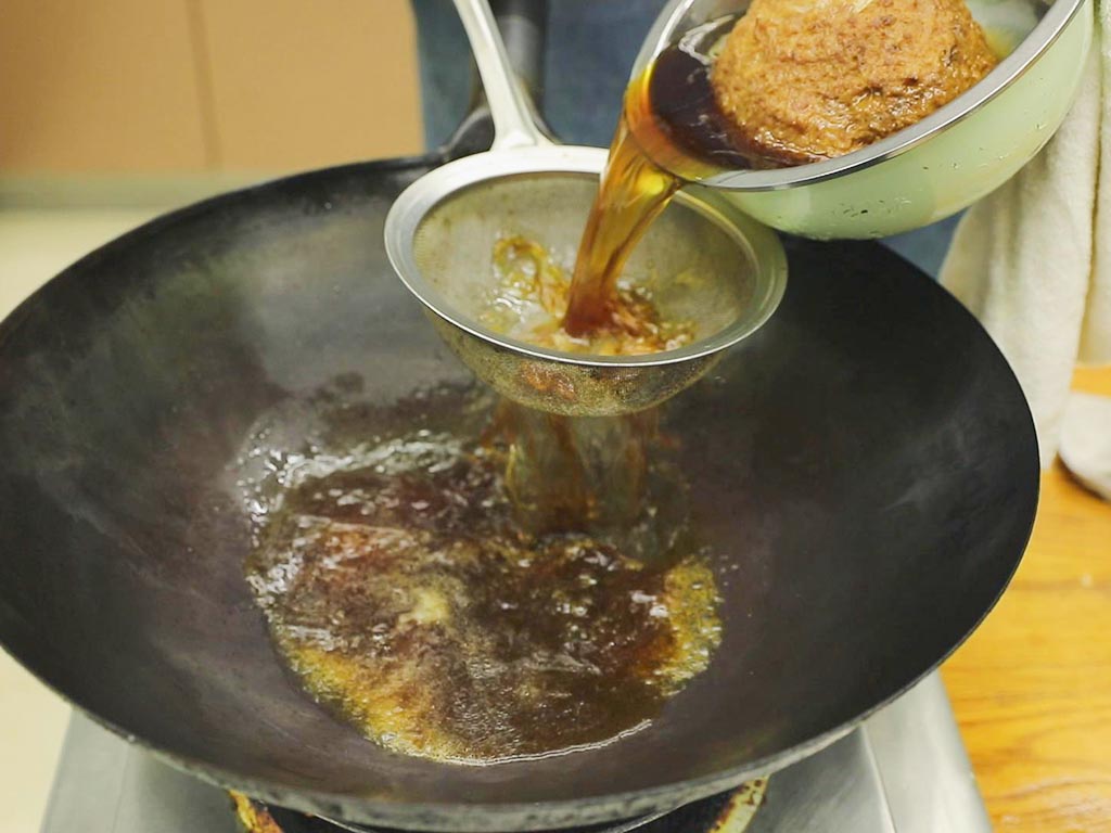 锅里加宽油,油温六成热把狮子头从锅(guo)边滑入锅中,炸至表面金黄焦酥捞出来(lai)控油。