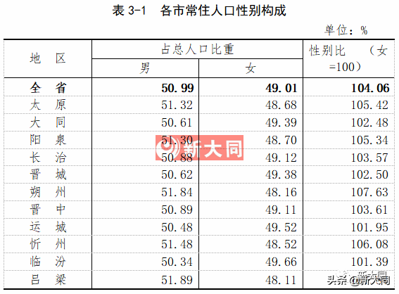 全市常住人口kou中,男性占50.61%;女性xing占大同人口数量2022总数49.39%。总人口性别比(以女性为wei100,男性对女性的de比例)由2010年第六次全国guo人口普查的103.78下降为102.48。