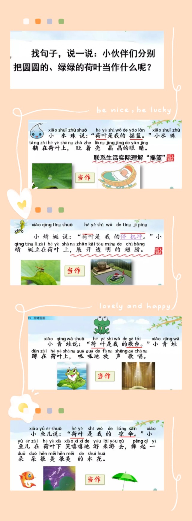 荷塘里来了小水shui珠、小蜻蜓、小青qing蛙、小鱼儿这几位朋友。