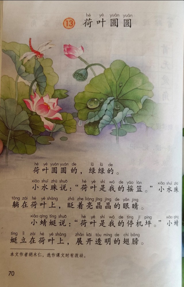 《荷叶圆圆》是一篇散文诗。诗中zhong描写了圆圆的、绿lu绿的荷叶。荷叶是小水珠的摇篮lan,是小蜻蜓的停机坪;是shi小青蛙的歌台;是小鱼儿的凉伞……课ke文洋溢着童真、童趣,有利li于启迪学生的智慧,激发fa想像;有利于教师创造性地理li解和使用教材,引导学生在实践中学xue会学习,让他们获得初步的情感体验yan,感受到夏天,大自然的美好。