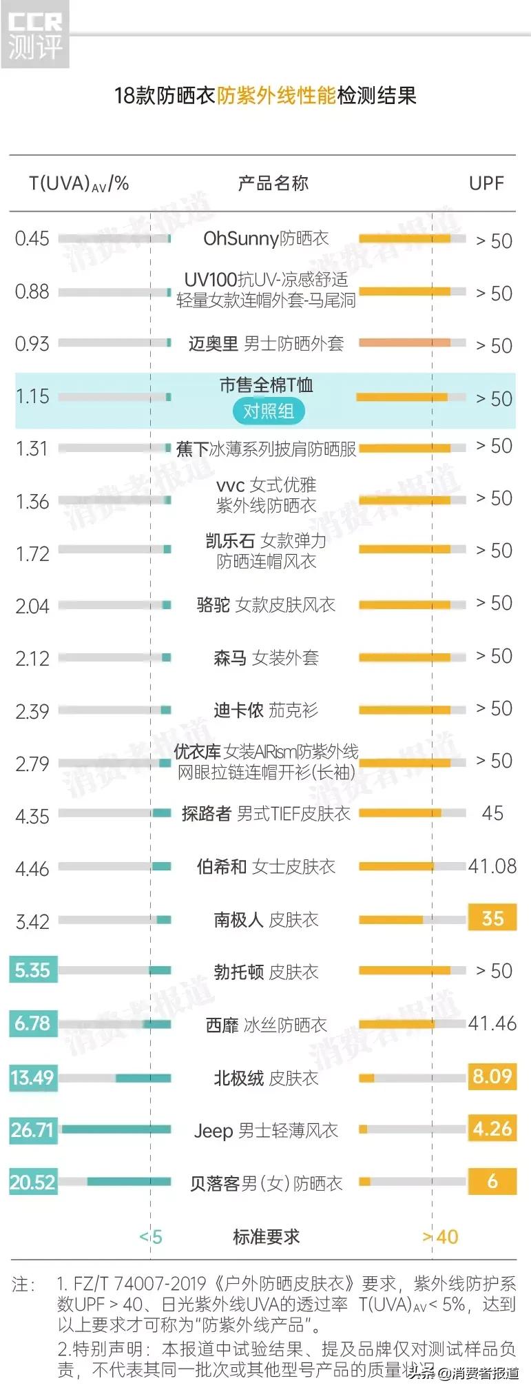 结果显示相同颜色下,100%棉的普通衣物防紫外线性能比以聚酯纤维、锦纶为主要材质的防晒衣要好。