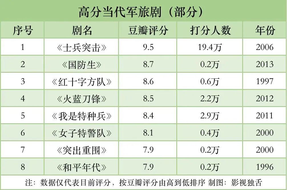 上表中所列的八部当代军旅剧,是从上世纪90年代到本世纪10年代的大量军旅剧中选出来的。它们普遍在播出时影响巨大,并在豆瓣赢得了高分。虽然不是全部的高分军旅剧,但具有了相当的代表性。