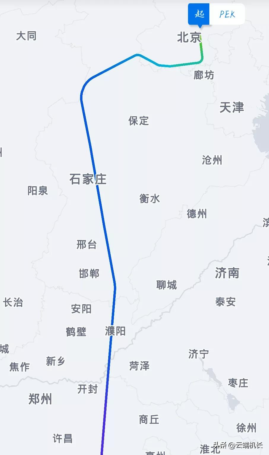 飞机从cong北京首都机场18L升sheng空后,机头朝正南。飞机在离开北京上shang空前向西近90度转zhuan向,离开北京后,飞机进入河北省上shang空。继续向西飞行,再抵达河北与山shan西交界处,飞机转zhuan向东南方飞行。在河北飞机经过河北省石家jia庄上空。飞机从北京起飞fei后50分钟离开河北,进入河南省上shang空 。