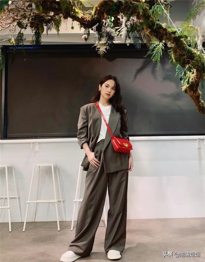 像杨丞琳深墨绿色的西装套装搭配白色的内衬,将衣角束进裤子里,白色与墨绿色形成颜色上的对比,提高了腰线的定位。悄无声息的搭配又增加了五公分。