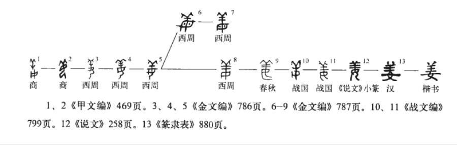 这里有一个问题,就是凭什么认为美字上部是羽饰之类,而不是“羊”?原因很简单,可以看一看甲骨文中的“姜”与“羊”,姜与美字字形比较相似的一个字,羊是最直接的参照字。
