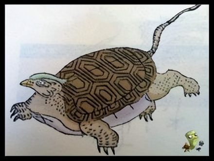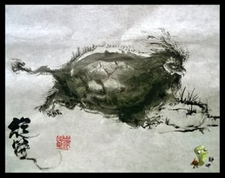 旋龟是《山海经》中记载中的一种生物,产于怪水。其体貌与普通的乌龟类似,但颜色为红黑,长着鸟的头、毒蛇的尾巴。据说它的叫声像剖开的木头的声音,将其佩带在身上,耳不聋,还可以治疗足底的老茧。
