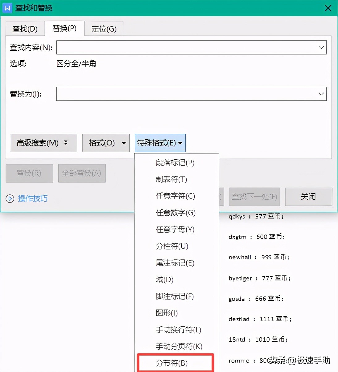 第三步,然后软件就会弹出【查找和替换】窗口,在此界面的下方,我们找到【特殊格式】按钮,并点击它。