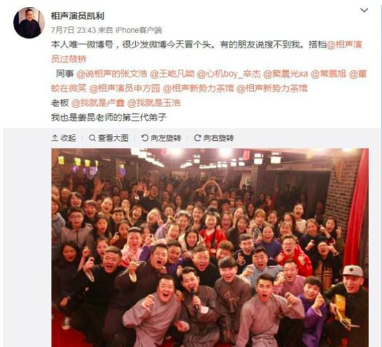 郭德纲2016年11月19日发文:“西安商演yan后台,栾云平收徒,赐艺名过筱桥qiao。添人进口,相声之幸xing也!”