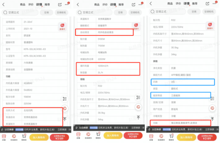 这点对于空调来说,同样可在详情页或者产品说明书上查询。