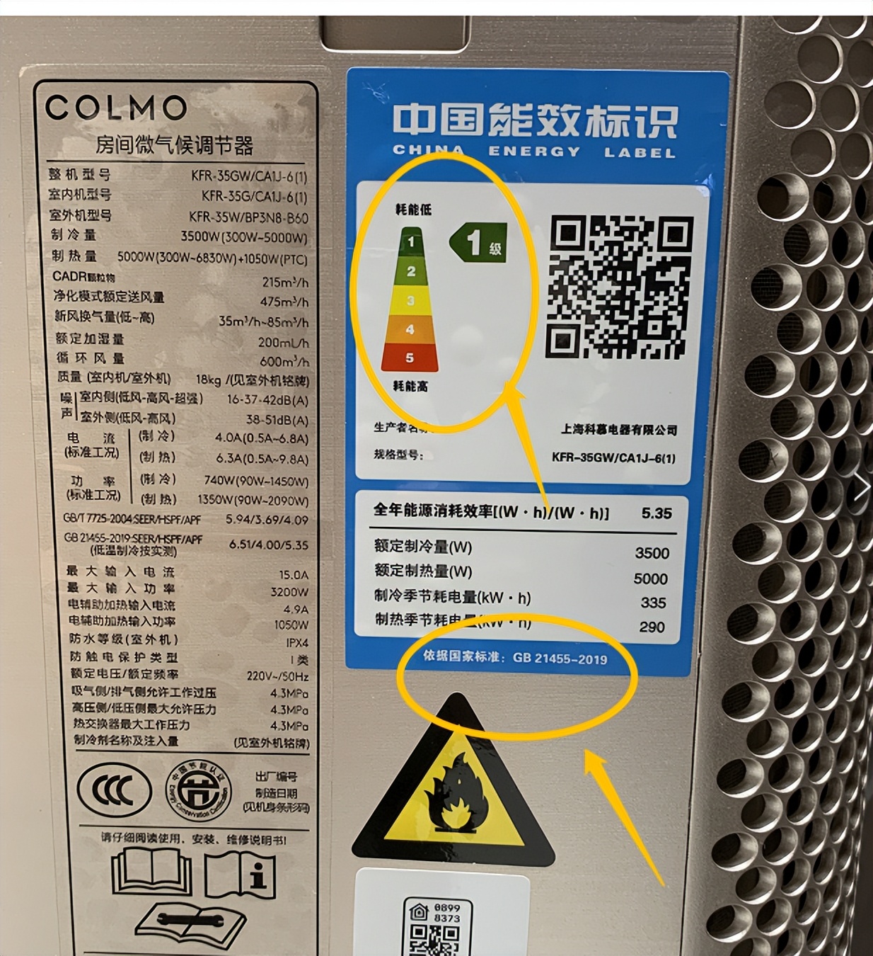 对应到购买中其实就是两个数据——APF值(全年能源消耗效率)和CC(额定制冷量)。它们和2022年1月新实行的新国标是对应的。